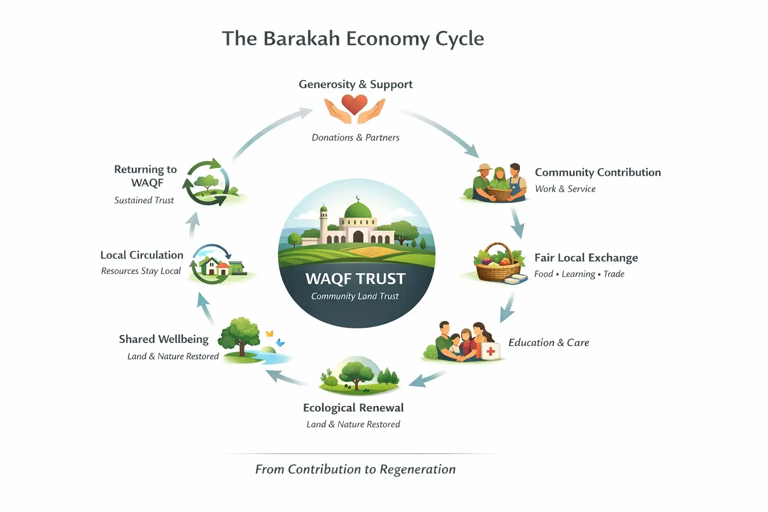 Sukun Academy and Ecovillage are envisioned to operate under one Community Land Trust (Waqf — sacred commons) and a regenerative livelihood model that keeps resources circulating ethically within the community.