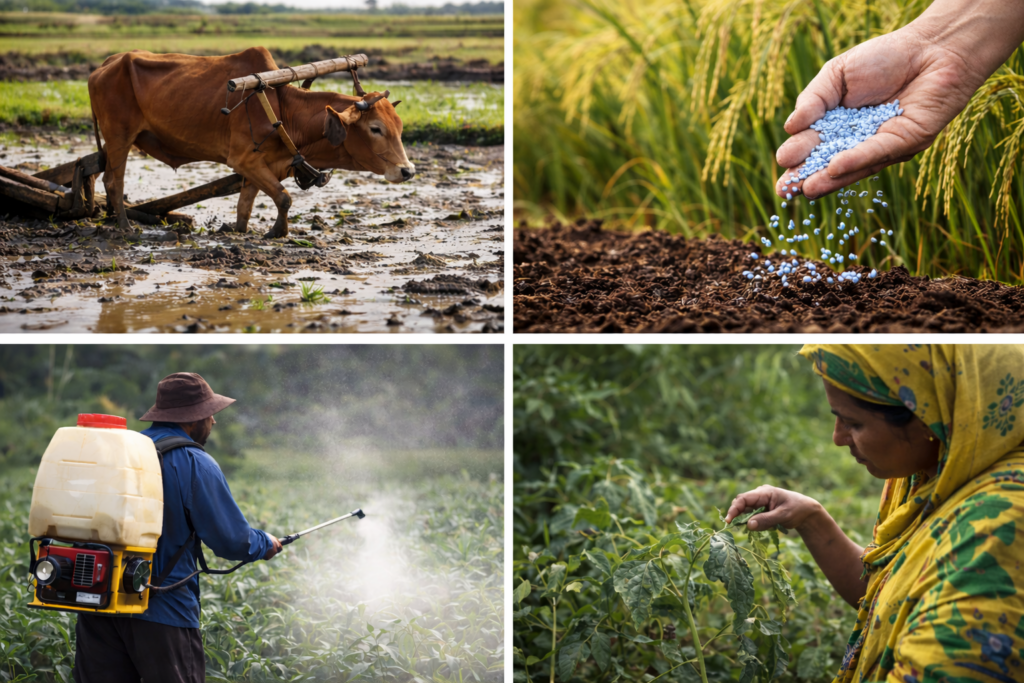 For ages, global agriculture was dependent on traditional farming practices. Crop production was constrained by frequent climate disasters and limited technological innovation. Many developing countries, including Bangladesh, suffered periodic famines as food production lagged population growth. Conventional techniques of rain-based irrigation, organic compost made from food waste, animal manure, and crop residues, and land plowing with oxen were predominantly used. These customs were also influenced by lunar cycles, seasonal rhythms, and indigenous community knowledge passed down through generations. Farmers typically planted local seed varieties, and very little modern machinery or fertilizer was used. Despite lower yields, crop cultivation was remarkably sustainable as soil quality remained intact.